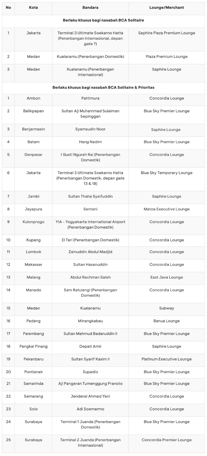 - BCA Solitaire: Bagi pemegang kartu dan 1 orang pendamping