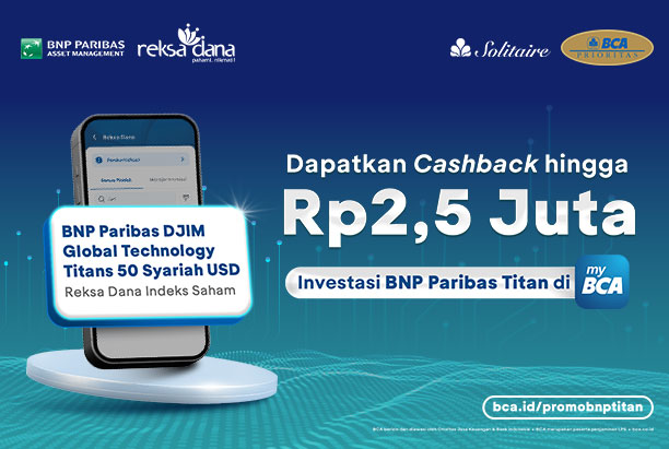 BCA bekerja sama dengan PT BNP Paribas Asset Management menghadirkan produk investasi baru, yaitu Reksa Dana BNP Paribas DJIM Global Technology Titans 50 Syariah USD (BNP Paribas Titan). Nasabah BCA Solitaire & Prioritas dapat melakukan pembelian produk BNP Paribas Titan dan dapatkan cashback sampai Rp2,5 juta. Cek lengkapnya