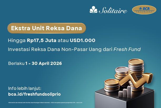 Khusus bagi Nasabah BCA Solitaire dan BCA Prioritas yang melakukan investasi Reksa Dana selain Reksa Dana Pasar Uang (RDPU) dari sumber dana fresh fund, Anda memiliki kesempatan mendapatkan tambahan Unit Penyertaan Reksa Dana hingga Rp17,5 juta dan/ atau USD1.000 untuk pembelian melalui fitur Investasi di aplikasi myBCA maupun cabang BCA yang melayani Reksa Dana.